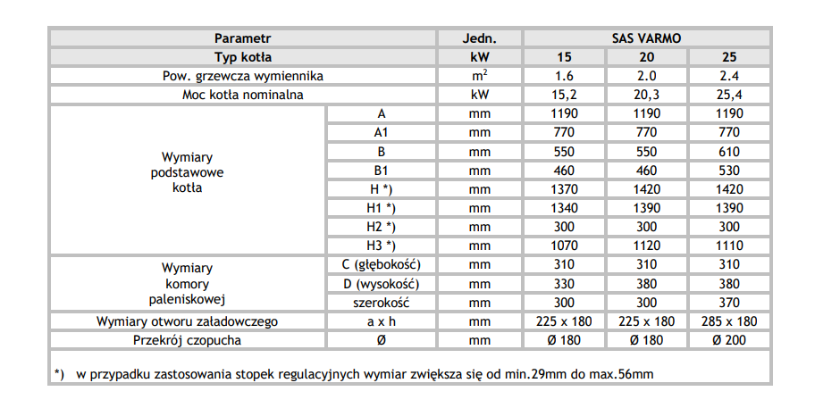 Kocioł zasypowy bez sterowania SAS VARMO dostarczony jest w stanie zmontowanym wyposażony w drzwiczki popielnikowe, paleniskowe, rozpalne, wczystne, wyczystki boczne oraz ogniotrwałe panele ceramiczne. Dodatkową przegrodę żarowa w drzwiczkach zasypowych oraz kratkę zabezpieczającą żar w drzwiczkach paleniska. Korpus kotła obłożony jest izolacją termiczną z wełny mineralnej, która posiada obudowę w postaci płaszcza z blach stalowych malowanych proszkowo o wysokiej odporności antykorozyjnej. Ewentualny montaż stopek regulacyjnych jest po stronie użytkownika zgodnie z wytycznymi podanymi w instrukcji obsługi kotła. Na wyposażeniu kotła SAS VARMO jest mechaniczny regulator temperatury w postaci miarkownika ciągu powietrza.